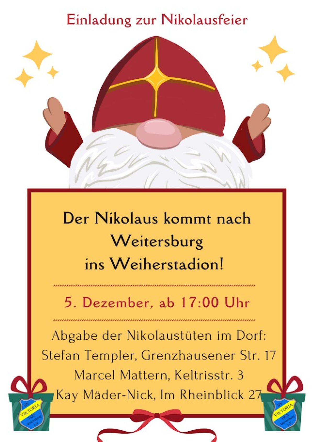 Auch in diesem Jahr hat der SV Viktoria Weitersburg den Nikolaus traditionell zum Nikolausabend eingeladen. Am Freitag, den 5. Dezember 2025, wird er ab 17:30 Uhr im Weiherstadion erwartet, um dort Kinder, Eltern und Großeltern herzlich zu begrüßen.